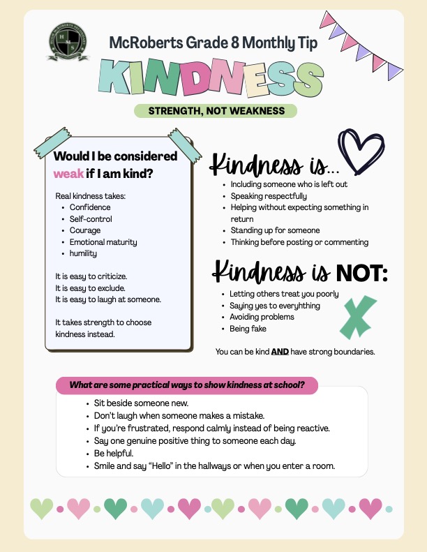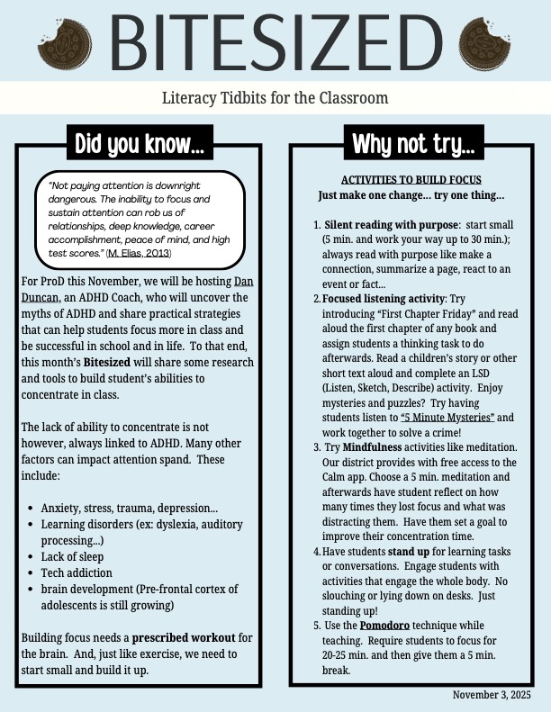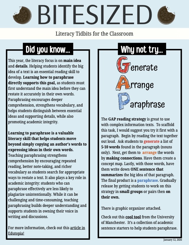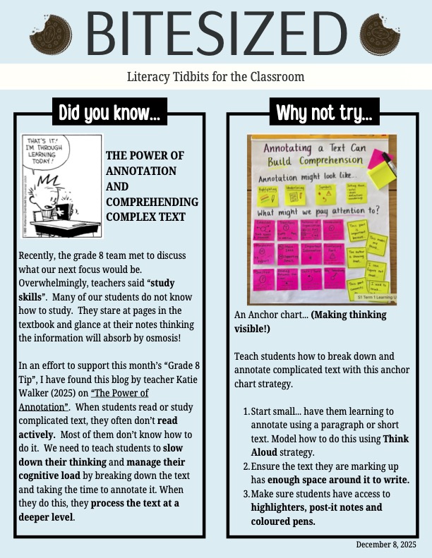 | An action that we have taken to support our school’s learning focus is: | Our Literacy Leader shared results from the Fall PBA exam with Grade 8 teachers to help identify students who might struggle with word skills. She then followed up with "Bitesized" teaching strategies handouts for teachers in November, December and January. These documents provide teachers with very "easy-to-use" teaching strategies deliberately targeting the areas of Summarizing and Identifying Main Ideas (seen in teh Fall PBAs as areas of potential weakness for our Grade 8 students). Our Grade 8 team continues to meet monthly, articulating areas of strength as well as stretches for our Grade 8 students. The team has developed monthly "Tip sheets" for Grade 8 learners (see below). |